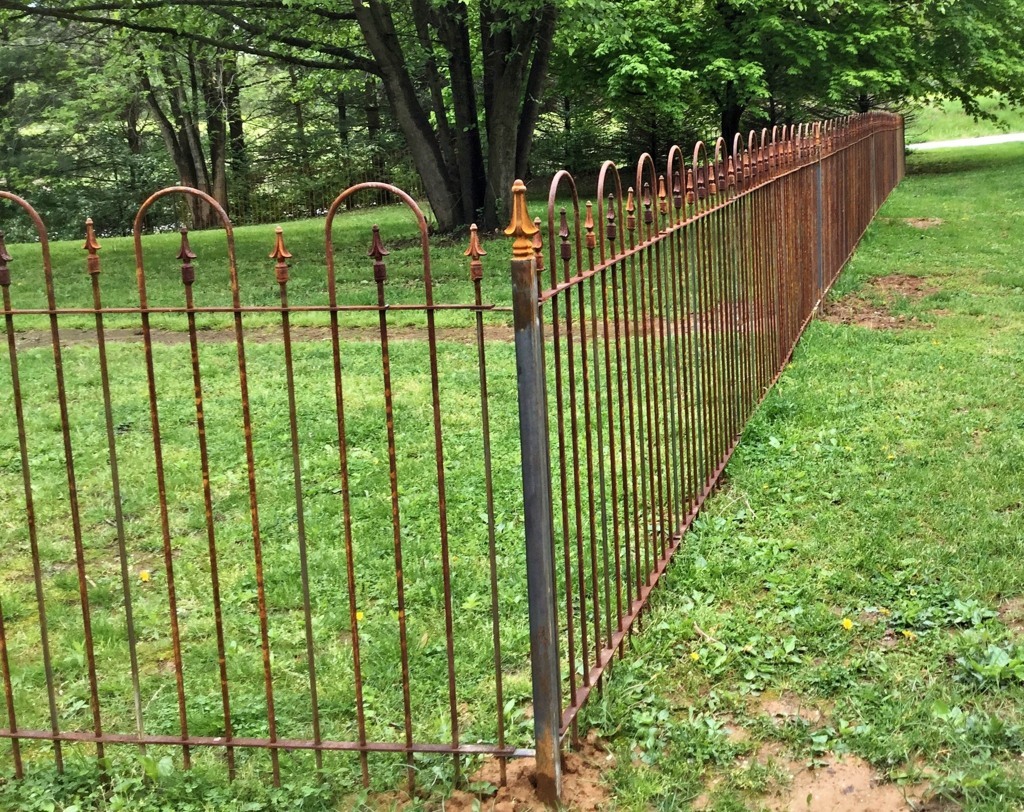 Our wrought iron fencing and gates are unfinished which oxidizes to a rusty finish. Our rustic looking fence works well with most homes and neighborhoods. The solid welded iron fencing will last for generations and never has to be painted. Some of our customers do choose to paint it and we recommend a rusty metal primer and then top coating.
