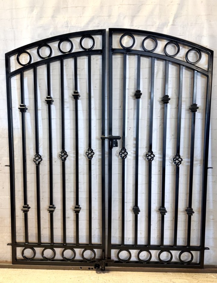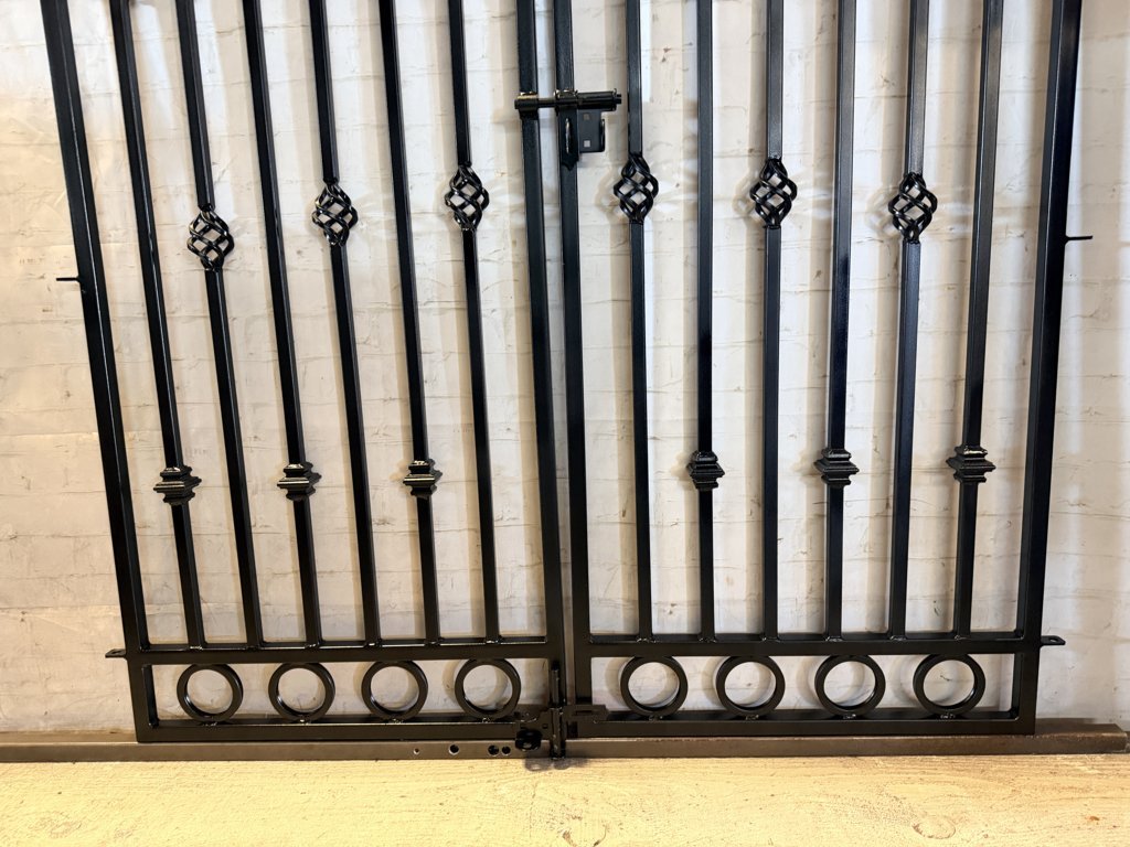 Check out our showy wrought iron center divide gate, combining the best features of two gate designs! The Wilmington is our top-selling model, enhanced with stylish circle patterns at the top and bottom. Need a specific size? No problem! We customize each gate to perfectly fit your space. Made from durable 1" square tube stock, our gates are designed for a perfect fit. Just measure your opening and choose that width from our options! When installed at the sides this gate will be 60" tall and the width range is close to 60".