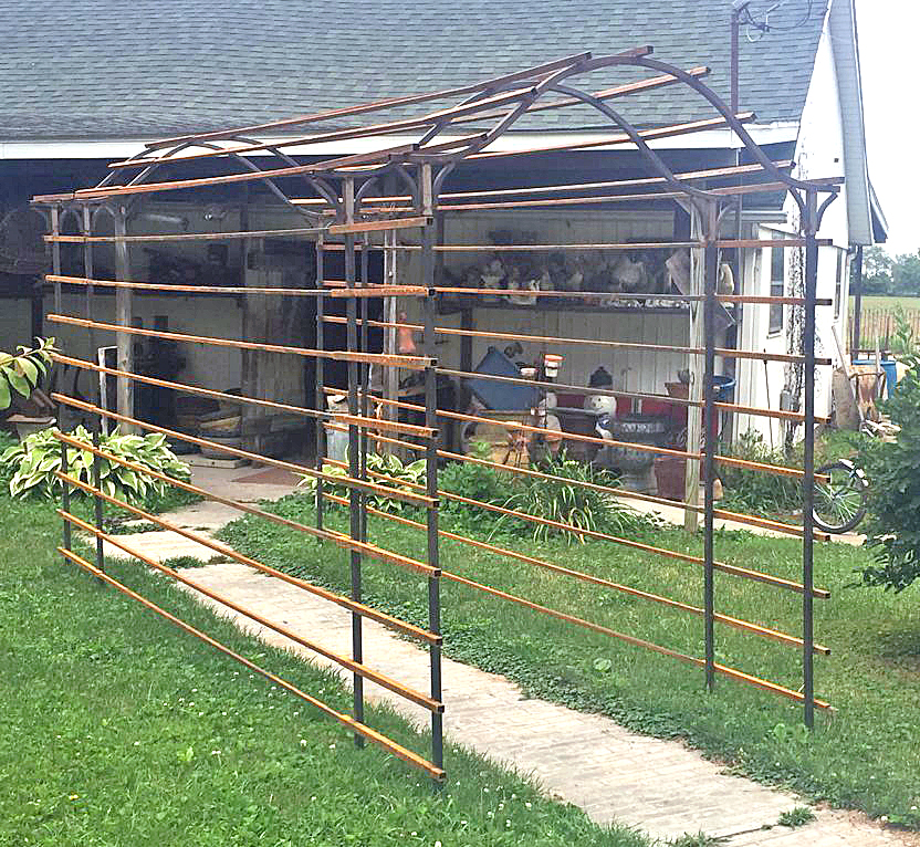 We are offering this yard structure that is made from lining up 2 wrought iron arbors. The connecting square 8' long rods get added from the ground up over the top and back down to the ground. Truly an enclosed tunnel ready for your climbing vines and flowers.